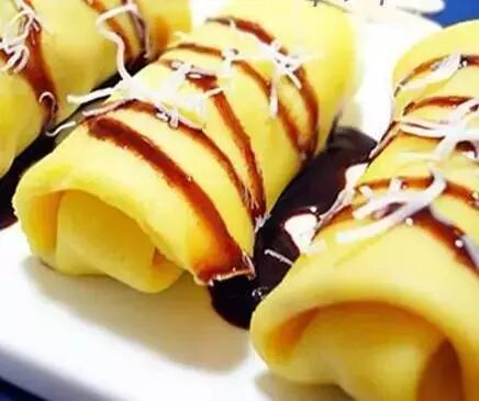 6.将香蕉卷入蛋饼内,表面挤上少许巧克力酱,撒上椰丝即成