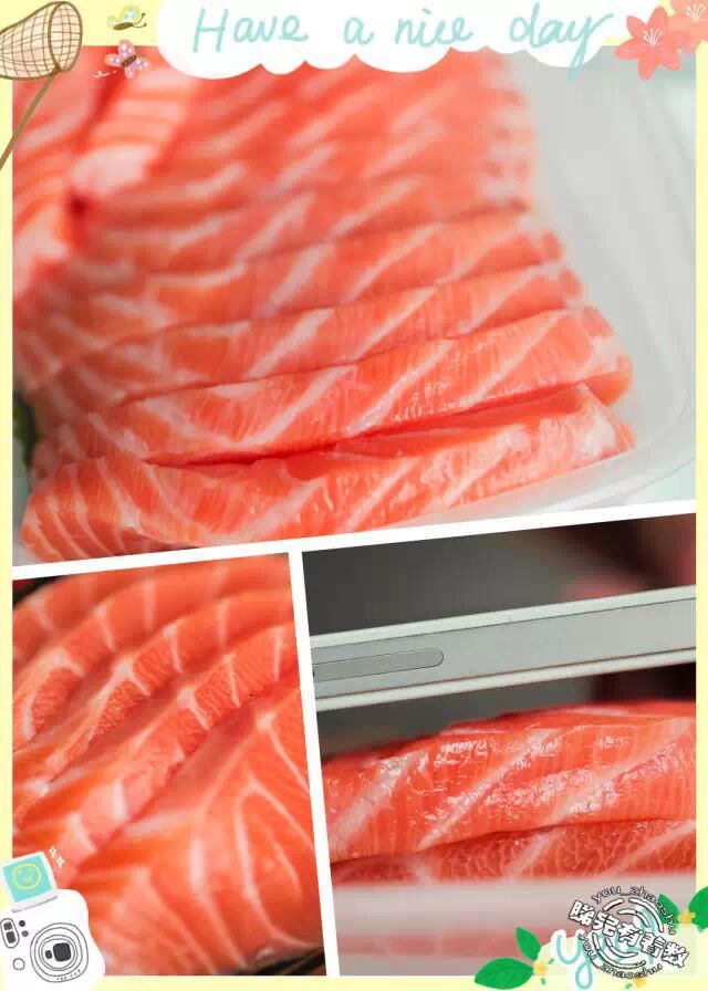 三文鱼刺身——开始觉得没什么特别,其实仔细看就发现不一样了!厚切程度简直令我等膜拜,Iphone一样的厚度,不信?有图有真相!
