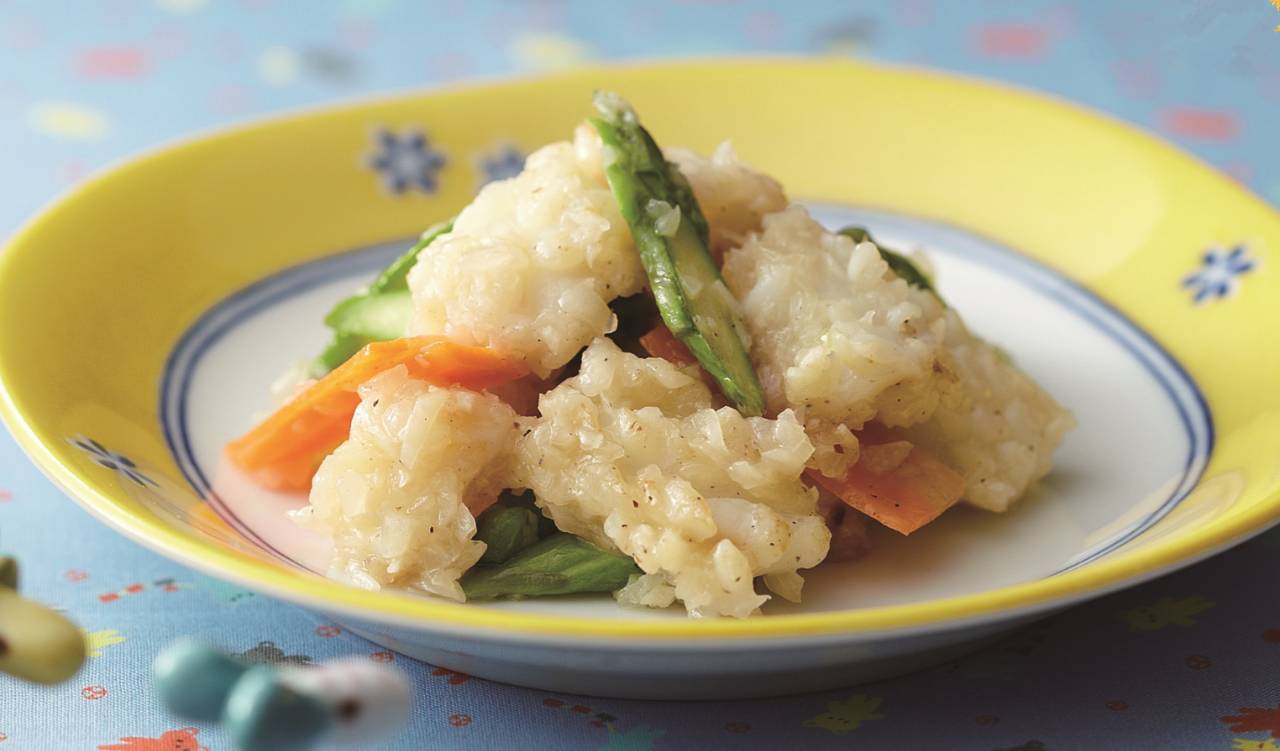 3. 平锅烧热,倒入色拉油,下洋葱、胡萝卜和芦笋炒,用盐调味后盛出。