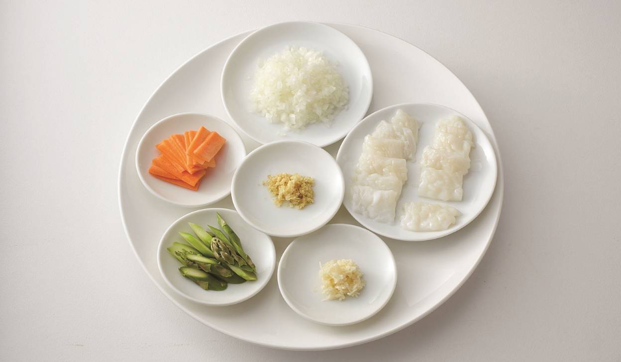 2. 胡萝卜切长方形短片,芦笋削去硬的部分后斜切成段,其他材料切碎。