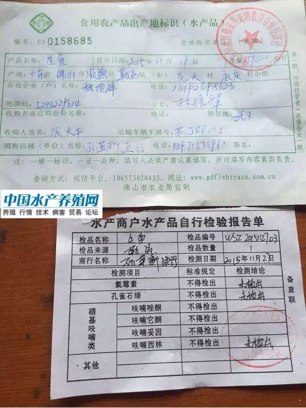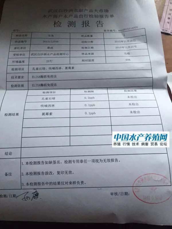 了解到,一份合格的检测报告单实际上有三张单据,每张单据的内容都不同,其中有两份是手工填写的,另一份是打印的最终检测报告单。武汉白沙洲水产市场黑鱼流通大户孙革新老板向中国水产养殖网提供了一份完整的检测报告单,其中有一份是由佛山农业局监制的“食用农产品出产地标识(水产品)”单据,盖有佛山市顺德区勒流街光明股份合作经济社公章的,上面写明了这批黑鱼的捕捞时间为2015年11月29日,重量是7000斤,产地是广东佛山市顺德区勒流镇光大村永庆组,另外还写明了这批黑鱼的追溯码、养殖户的姓名手机号、收购人姓名及运输车辆车牌号,最终发货地为武汉白沙洲水产市场孙革新渔行,孙革新老板的手机号也明确注明了。第二份单据是由武汉白沙洲农副产品大市场盖章的“水产商户水产品自行检验报告单”,上面写明了检品名称、检品编号、检品来源、检品数量、商行名称、检测日期,明确注明了氯霉素、孔雀石绿及硝基呋喃类等三大类不得检出的项目。样品检测结束后还有一份最终的检测报告,最终的检测报告除了送检人签字之外,均为电脑打印,不得涂改或者复印,里面除了注明检品名称、检品编号、检品来源、检品数量、商行名称、检测日期,还有检测的环境温度相对湿度,检测项目和检测依据均为ELISA酶联免疫法。2015年11月27日这份报告单一共检测了三个项目,孔雀石绿、呋喃西林、氯霉素,检测均未超标。