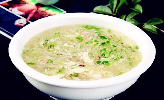 奶汤鱼皮要选用连云港特产的海口白河鱼皮,配以火腿、冬菇、虾仁、兰笋等料,加鸡汤烧制而成,虾仁盖在汤面。
