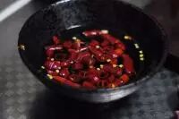 6.摆上红椒和花椒,把油烧开淋在花椒上面。