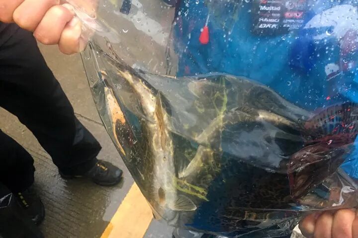 ▼称重最重的一组:两条鳡鱼+一条鲑鱼,累计15.51公斤(图片所示为单条重量9.52公斤)。