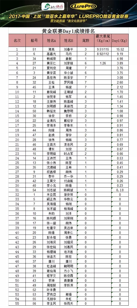 中国上犹路亚黄金联赛,第一天成绩总钓获:88尾(鳡鱼4尾)。