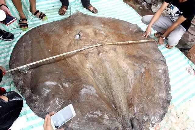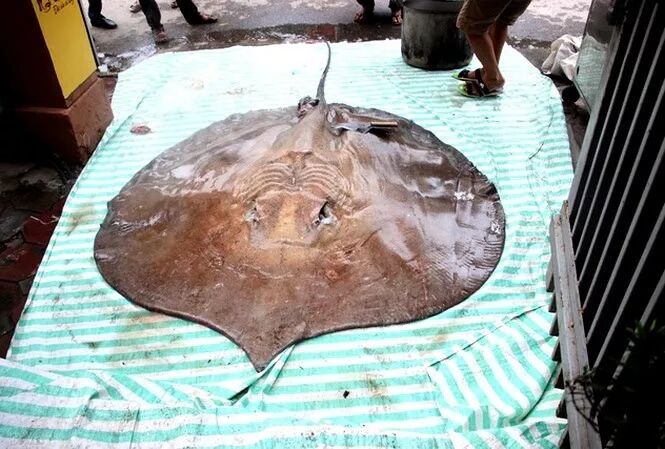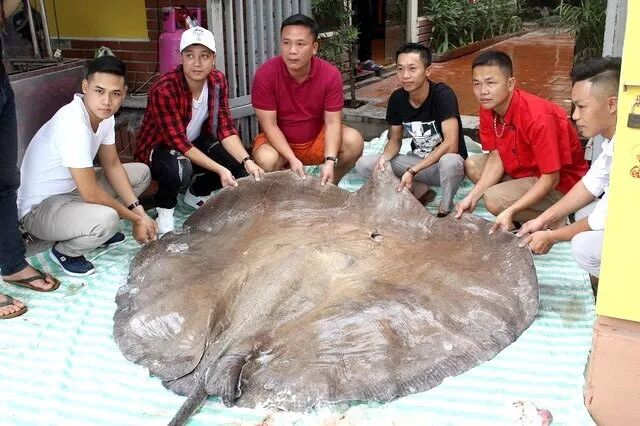 9月21日晚,越南河内一家餐厅的老板从泰国购买了一条重216公斤、3.2米长、1.9米宽的黄貂鱼 。 这条巨大的鱼“乘坐”飞机从泰国前往越南的河内。
