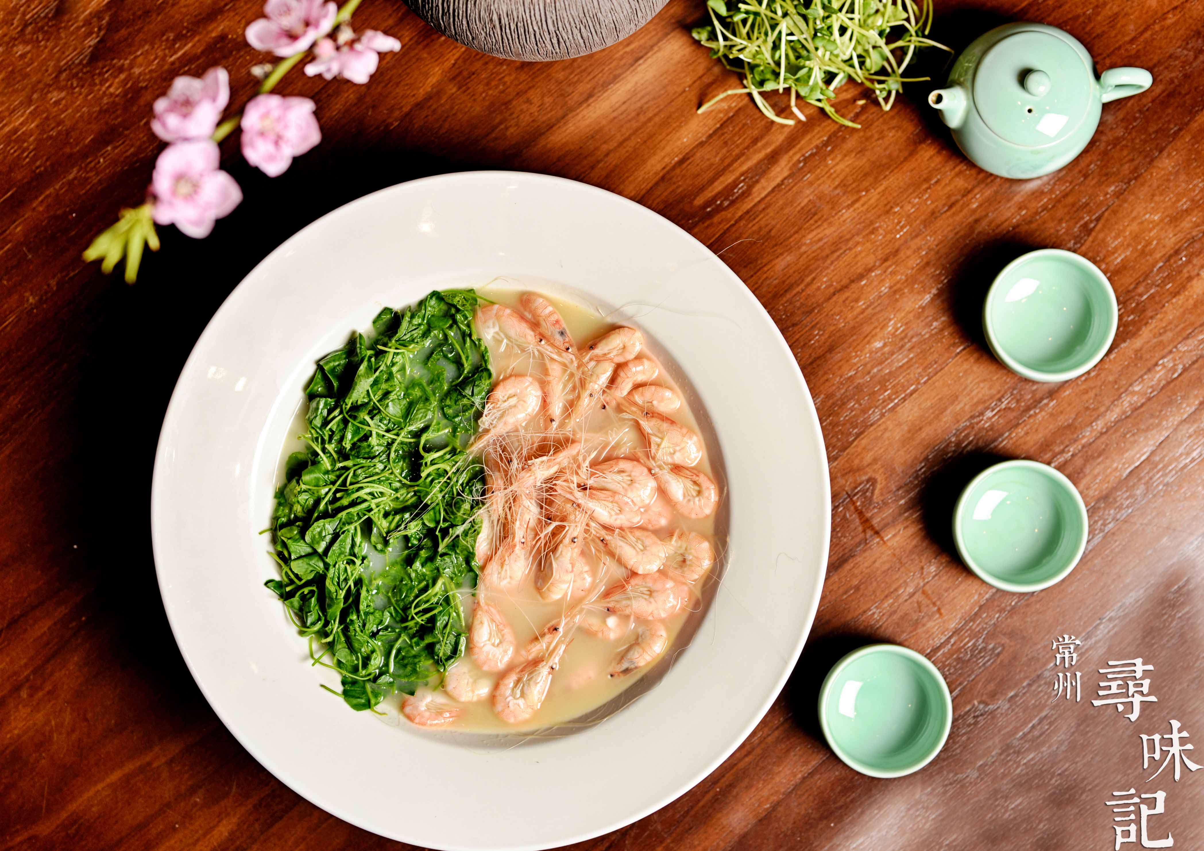 这道颜色煞是好看的金花菜白虾吃口也是一清淡和鲜嫩。金花菜炒着吃太老,必须宽汤做,搭配来自太湖的白虾。