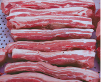鲜肋条肉刮洗干净,放水淹没,加葱姜、绍酒,煮到八成熟,捞入大盆里,用煮肉的原汤将其淹没,直至冷却后,取出切成长方块。(当然,也可以在原汤锅里冷却)