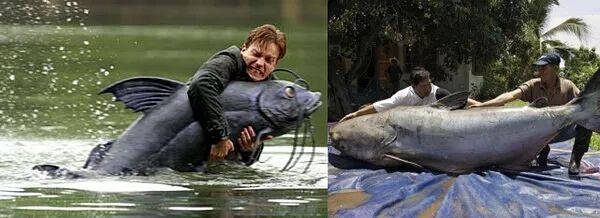 左图:电影《Big Fish》中的鲶鱼。右图:2005年在泰国捕获的巨无齿?它在捕上来时挣扎了超过一个小时。研究人员本来想采集完鱼卵之后将其放生,结果时运不济,最后它还是没能活下来。再后来,它成了当地村民餐桌上的佳肴。
