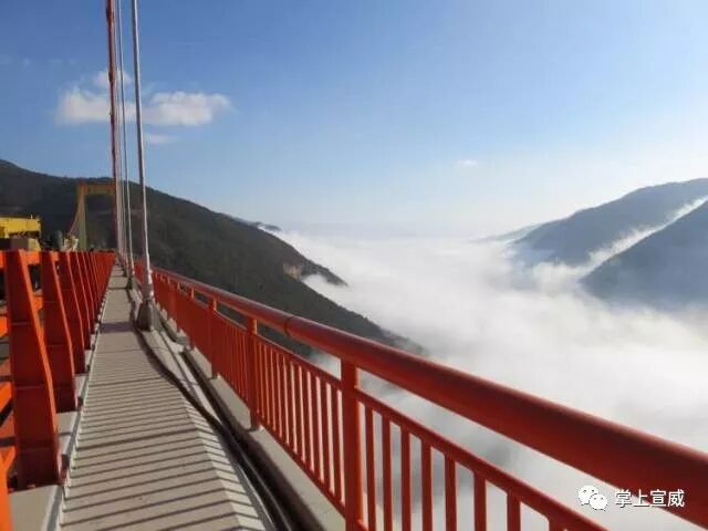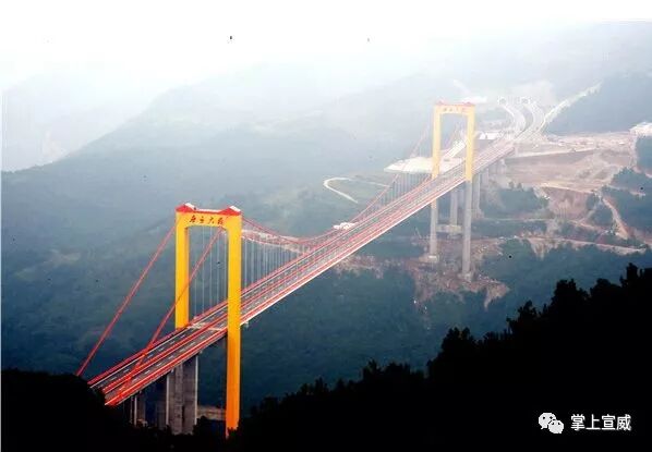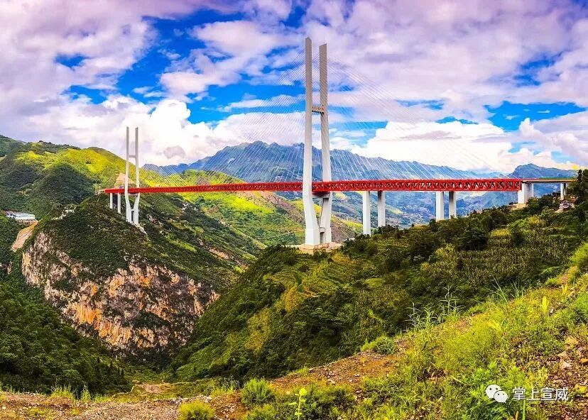 位于云南宣威的普立乡腊龙村与贵州省六盘水市水城县都格乡交界的尼珠河大峡谷上。是目前世界上最高的钢箱梁悬索大桥,云雾缭绕时仿佛是座天空之桥,行走之上宛如腾云驾雾。