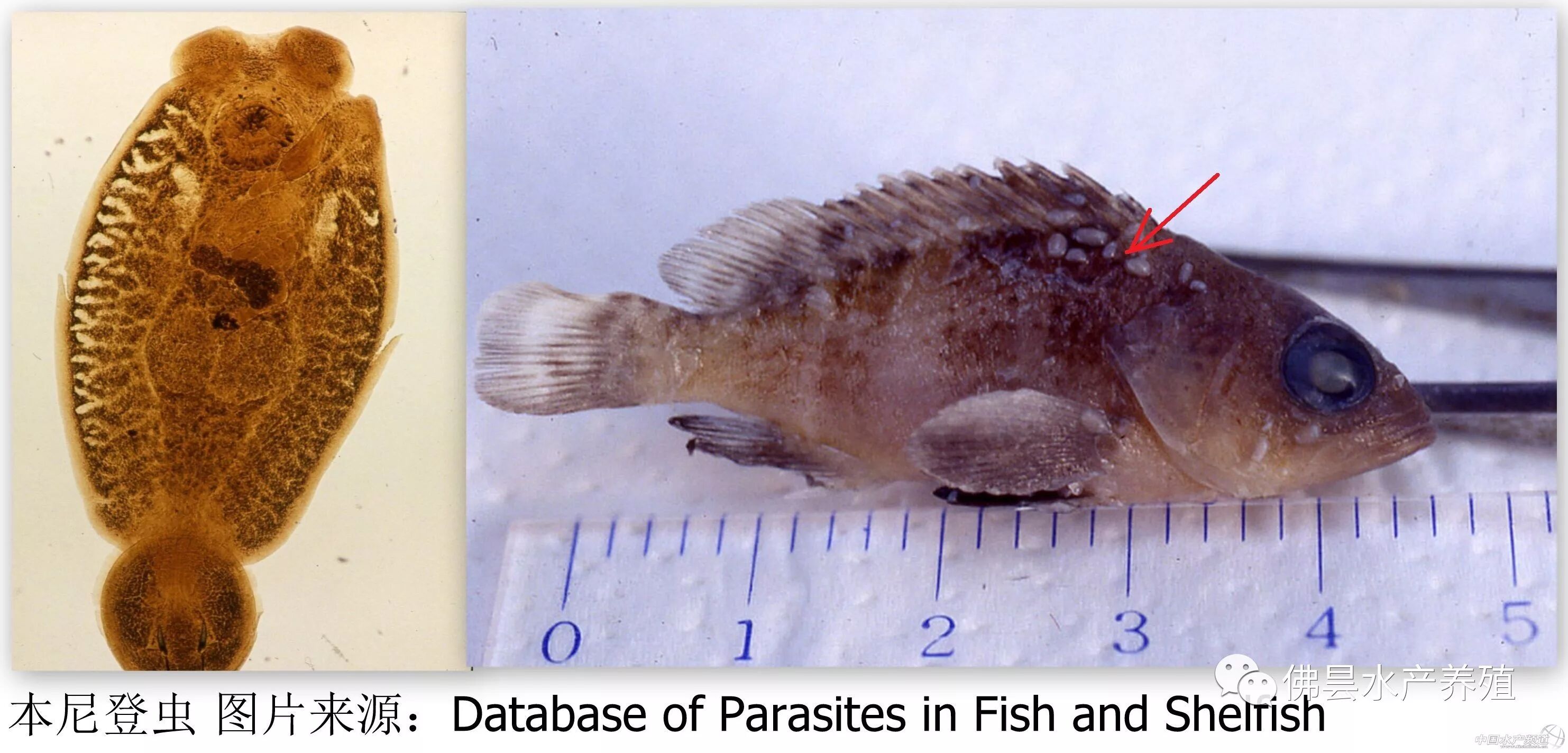本尼登虫(Benedenia)在形态上很好辨识, 显微镜下能看到头部有两个口吸盘,尾部是一个盘状的固着器。成虫体长约2-3mm,肉眼就可以看到,但是由于这种寄生虫会钻到石斑鱼的鳞片下面,直接观察看不出来,一般是将鱼放在淡水里泡半分钟左右,本尼登虫就会爬出来,虫体发白呈鳞片状。