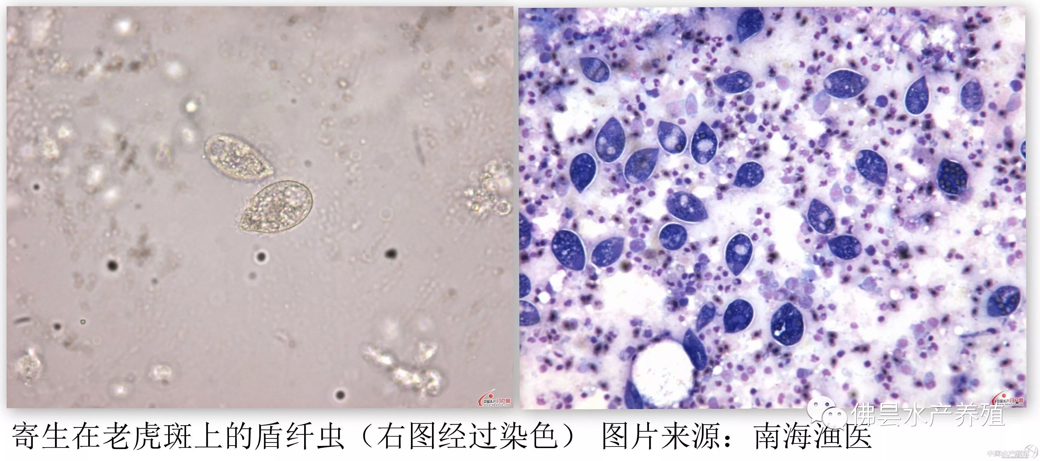盾纤虫的种类也非常多,主要寄生在鲆鲽鱼类身上,目前有定种的,包括牙鲆身上发现的贪食迈阿密虫(Miamiensis avidus)、指状拟舟虫(Paralembus digitiformis);在大菱鲆上发现的蟹栖异阿脑虫(Mesanophrys carcini)、弗州拟尾丝虫(Parauronema virginianum)等等。南海渔医有报道过一例在老虎斑脑部大量寄生的盾纤虫。