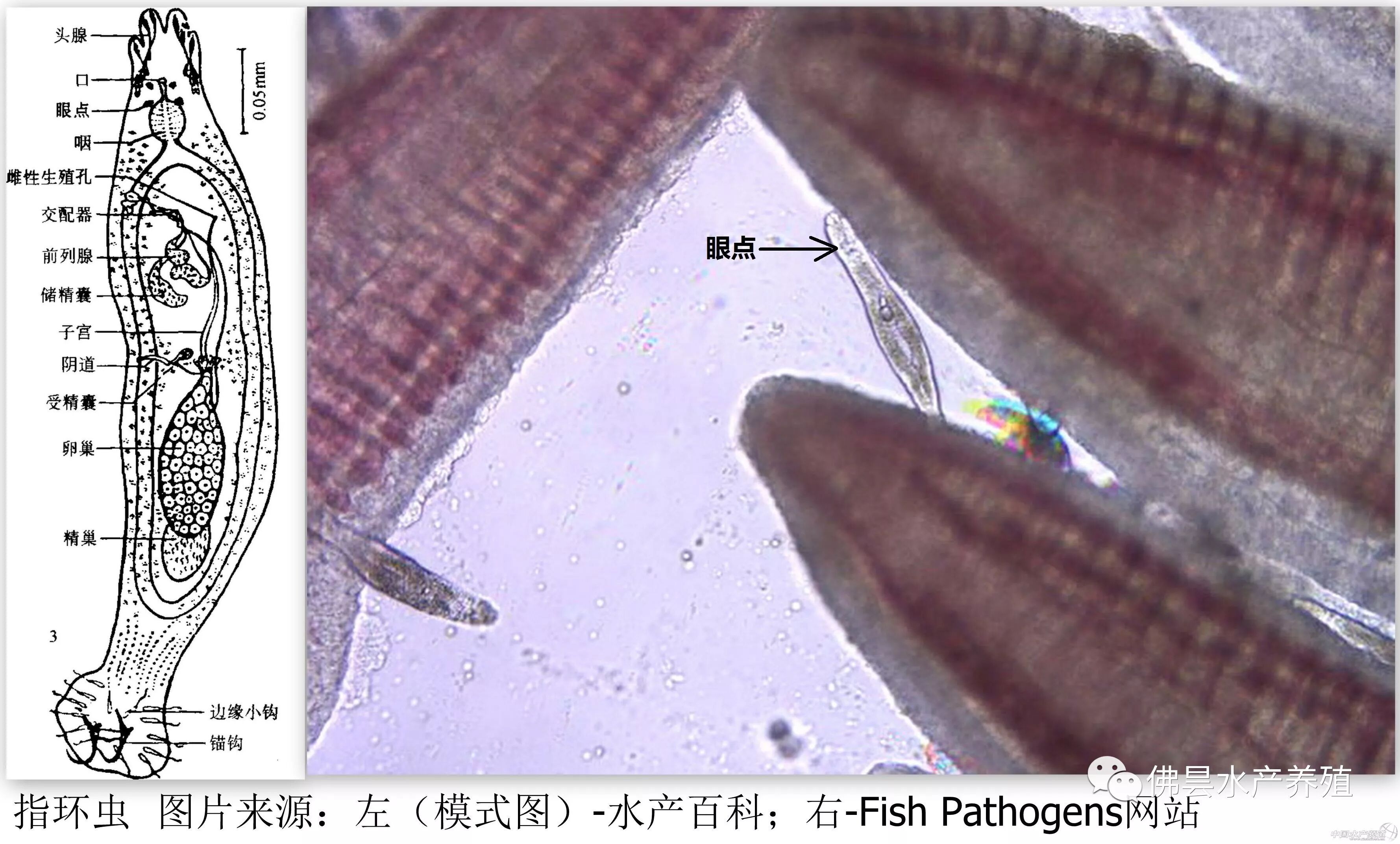 这三种寄生虫同属于单殖吸虫下面的单后盘目,形态上比较相近,容易混淆。显微镜下指环虫(Dactylogyrus)和三代虫(Gyrodactylus)的大小相近,成虫体长一般不超过2mm,两者最关键的区别在于指环虫有四个眼点,而三代虫没有;拟合片虫(Pseudorhabdosynochus)多发生在青斑上,它与指环中形态相近,常被误当成指环虫,实际上这种虫比指环虫要大好几倍,压片下能看到很小的米黄色小虫子(详见报道:青斑重要虫害-拟合片虫(南海渔医)),此外,拟合片虫的一个重要特征就是交接器呈鼠状。这几种单殖吸虫都主要寄生于鱼类鳃部,其吸盘上有锚钩钩住鳃组织,不断在鳃丝上爬动破坏鳃丝的表皮细胞,刺激鳃丝分泌过多的黏液,妨碍鱼呼吸,严重时造成贫血。所以,此类吸虫也常被称作鳃吸虫。