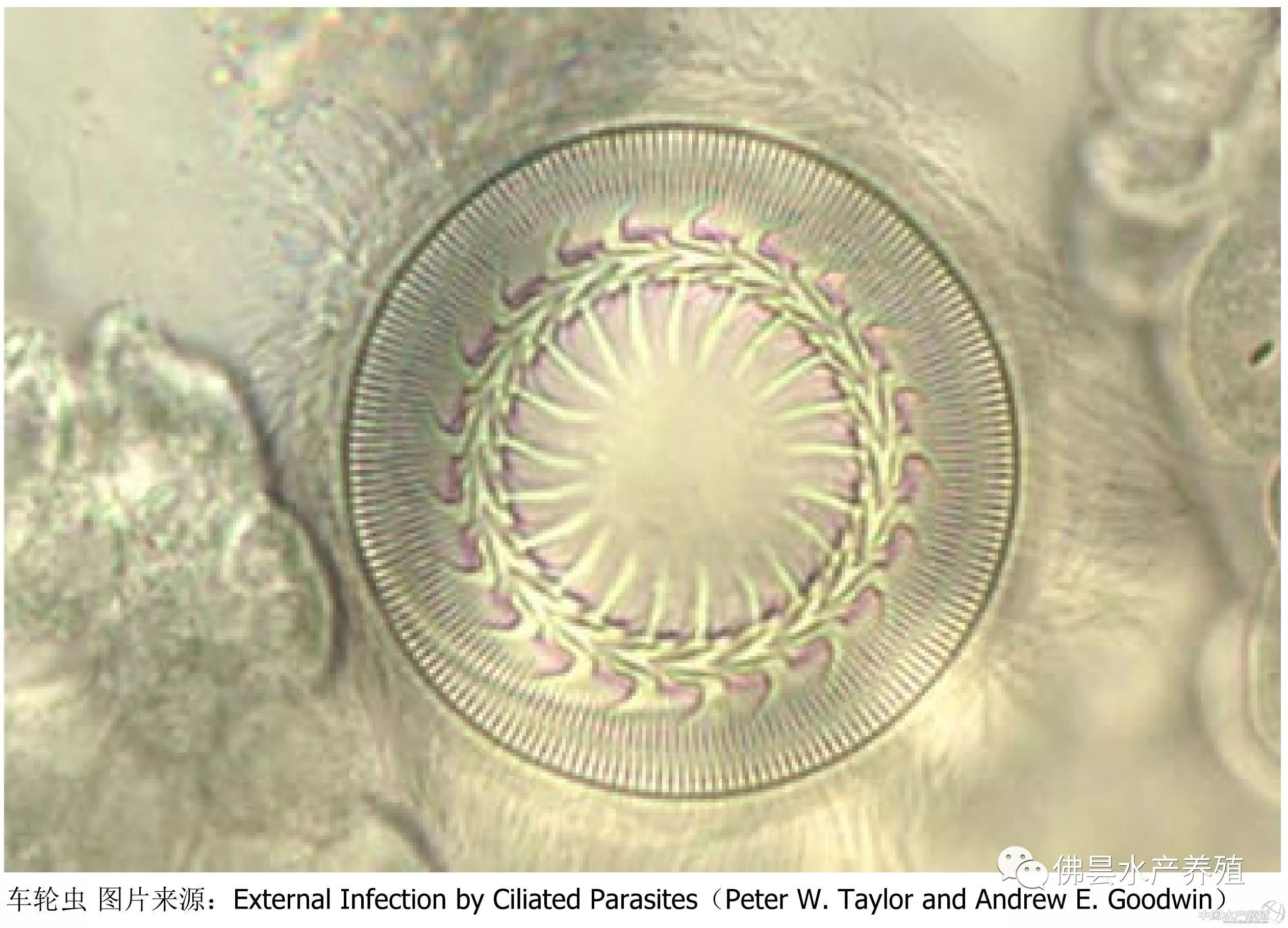 车轮虫(Trichodinidae)是鱼类养殖中最为常见的寄生虫之一,在分布地位上与杯形虫(Scyphidiidae)、累枝虫(Epistylididae) 、钟形虫(Vorticellidae) 等相近,同属纤毛动物门下的寡膜纲、缘口亚纲。其特征是体纤毛退化,口缘纤毛发达,覆盖虫体顶端形成围口盘。其中,车轮虫能像车轮一样转动游泳,属于缘口亚纲下的游泳目;而杯形虫、累枝虫、钟形虫等则通过反口面的一长柄,附着在其它生物上不游动,属于固着目,包括聚缩虫(Zoothammniidae)等都属于这类,形态大同小异,都呈倒钟罩形。