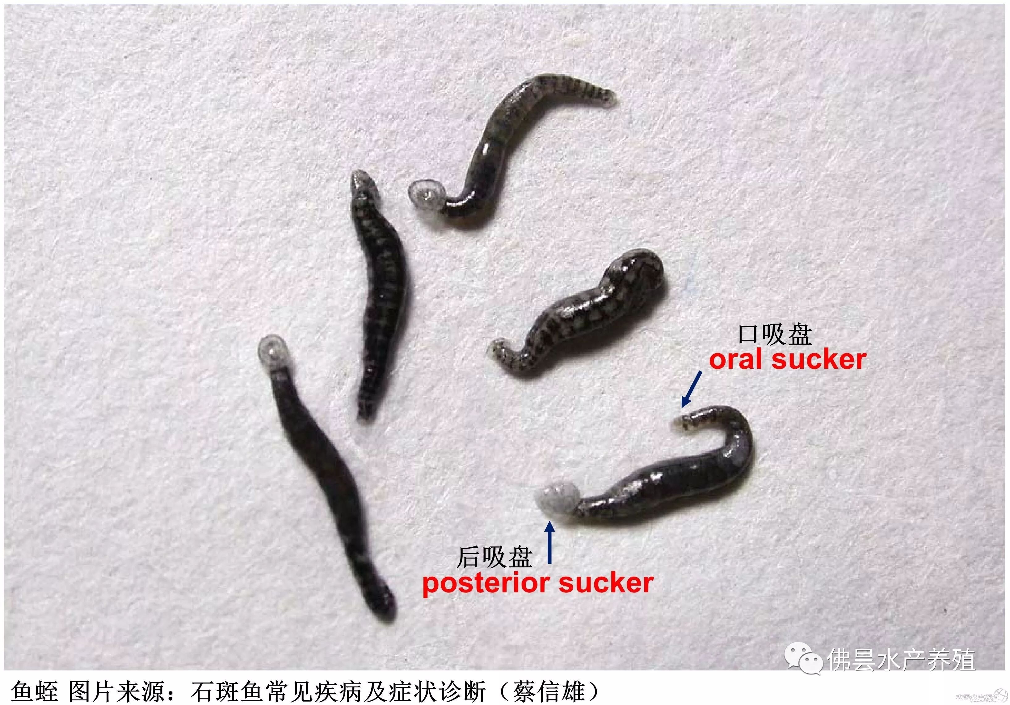 鱼蛭(Piscicola)是水蛭(蚂蟥)的一种,淡、海水鱼中均有发现。虫体扁平细长,1-2cm,前后各有一个吸盘,前吸盘较小,由口部周围肌肉形成,用来吸附于宿主以吸食血液;后吸盘较大,与前吸盘协作在宿主上爬动。鱼蛭寄生吸取血液会导致石斑鱼贫血和呼吸困难,鱼体衰弱抵抗力差。鱼蛭吸饱之后便离开寻找下一个寄主,留下的伤口又容易引发细菌性感染。对幼鱼杀伤性更大。