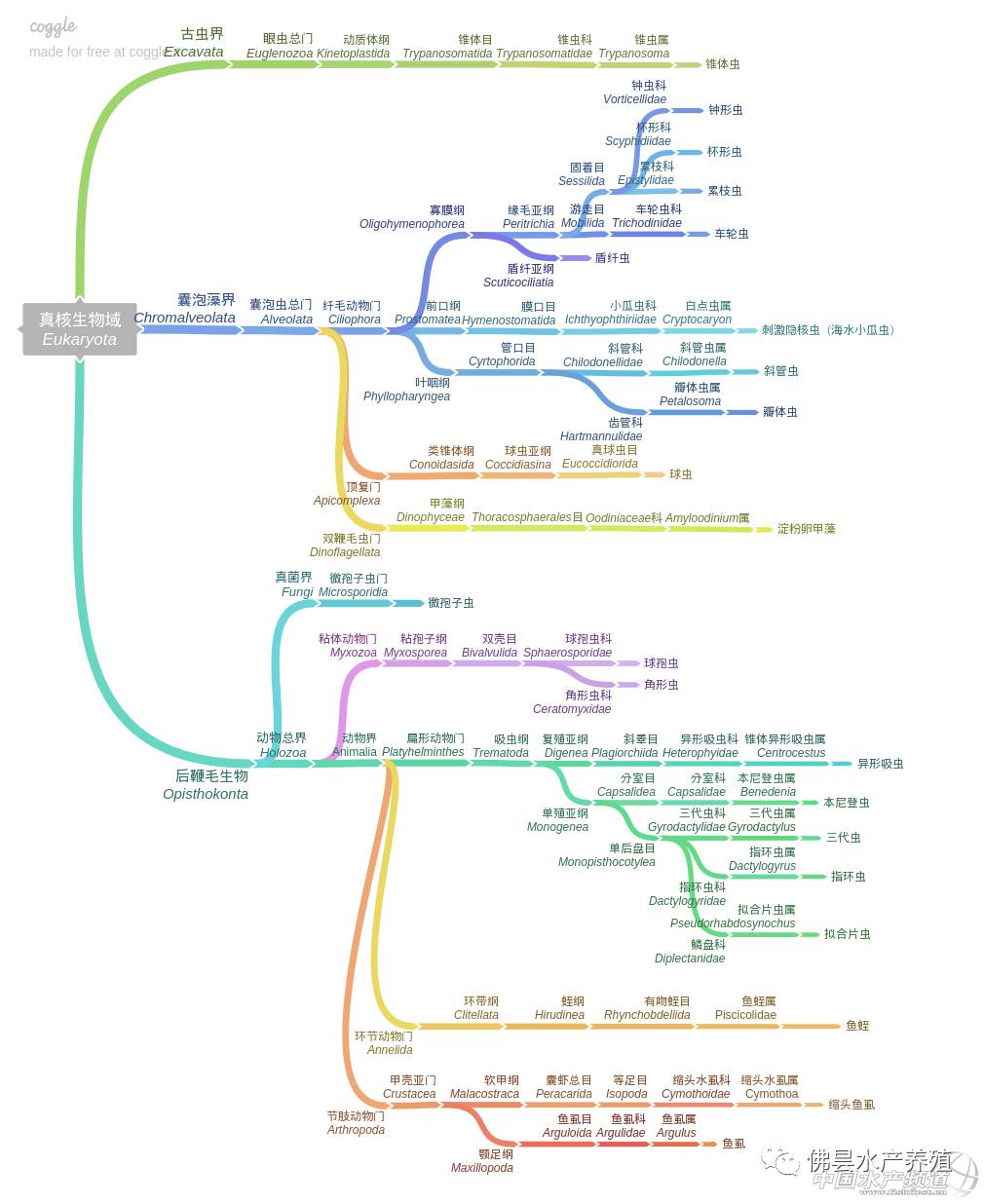 图中寄生虫的分类地位是通过网站EOL(Encyclopedia of live)查询获得,大类上采用2005年“国际原生生物学家协会”提出的六界说,将真核生物分成古虫界、变形虫界、后鞭毛生物、有孔虫界、囊泡藻界 、泛植物界,取消了传统的原生生物界,细支上多数采用NCBI分类法,然而并没有统一的分类标准,分类学为一门复杂的学科,有错的地方还望专家见谅。