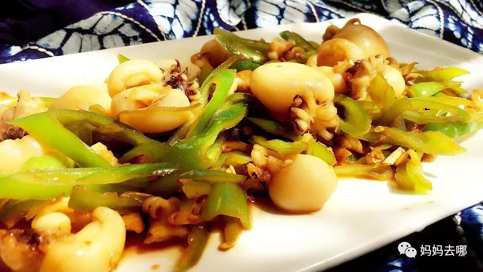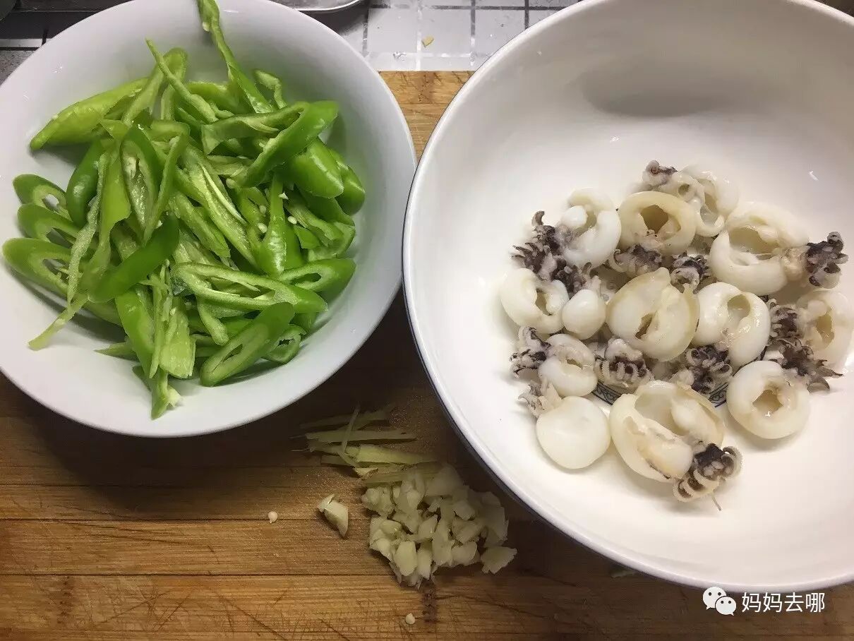 原料:墨鱼仔半斤,尖椒4个,甜面酱2勺,生抽2勺,白糖一勺,姜、蒜适量,植物油适量。