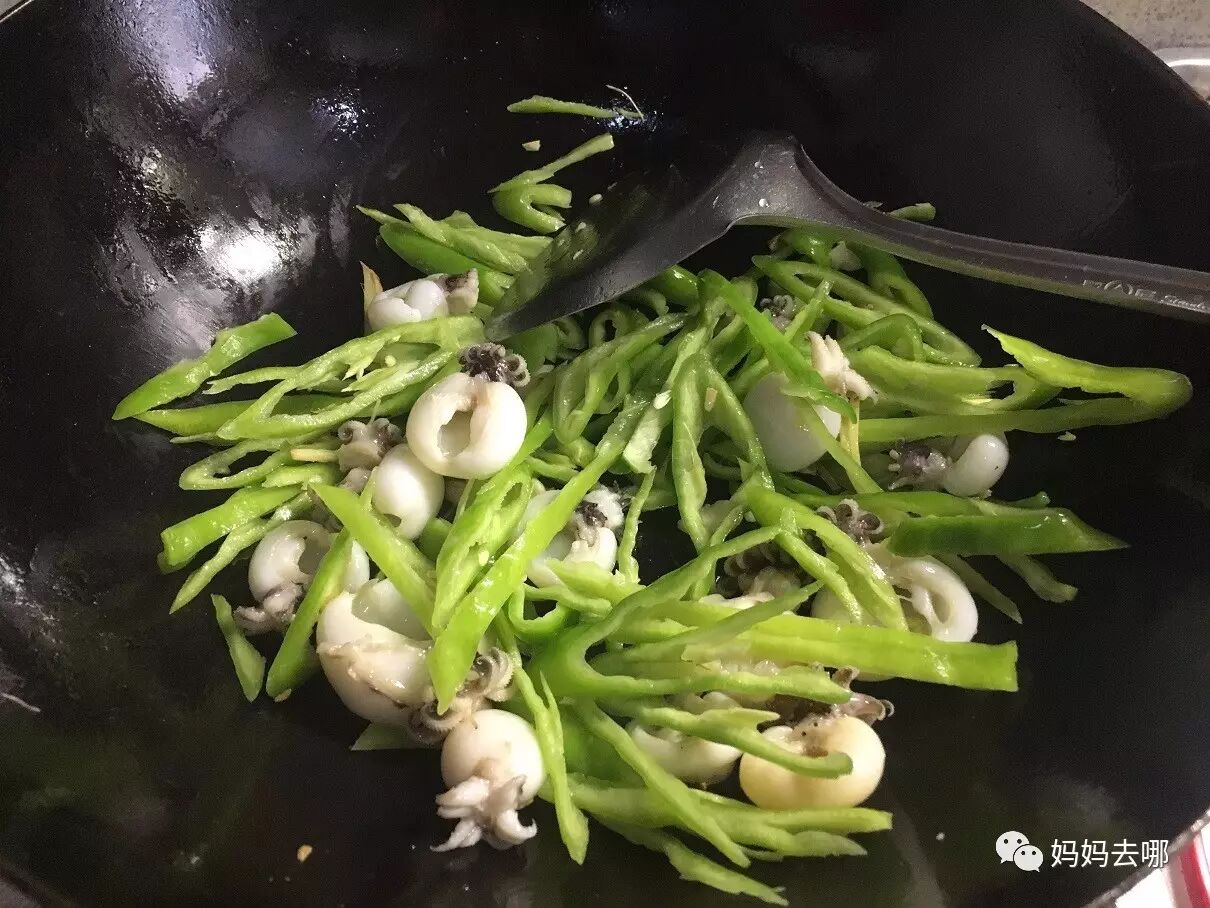炒锅热油,4成热下姜丝和蒜末爆香,下墨鱼仔和尖椒丝,炒匀。