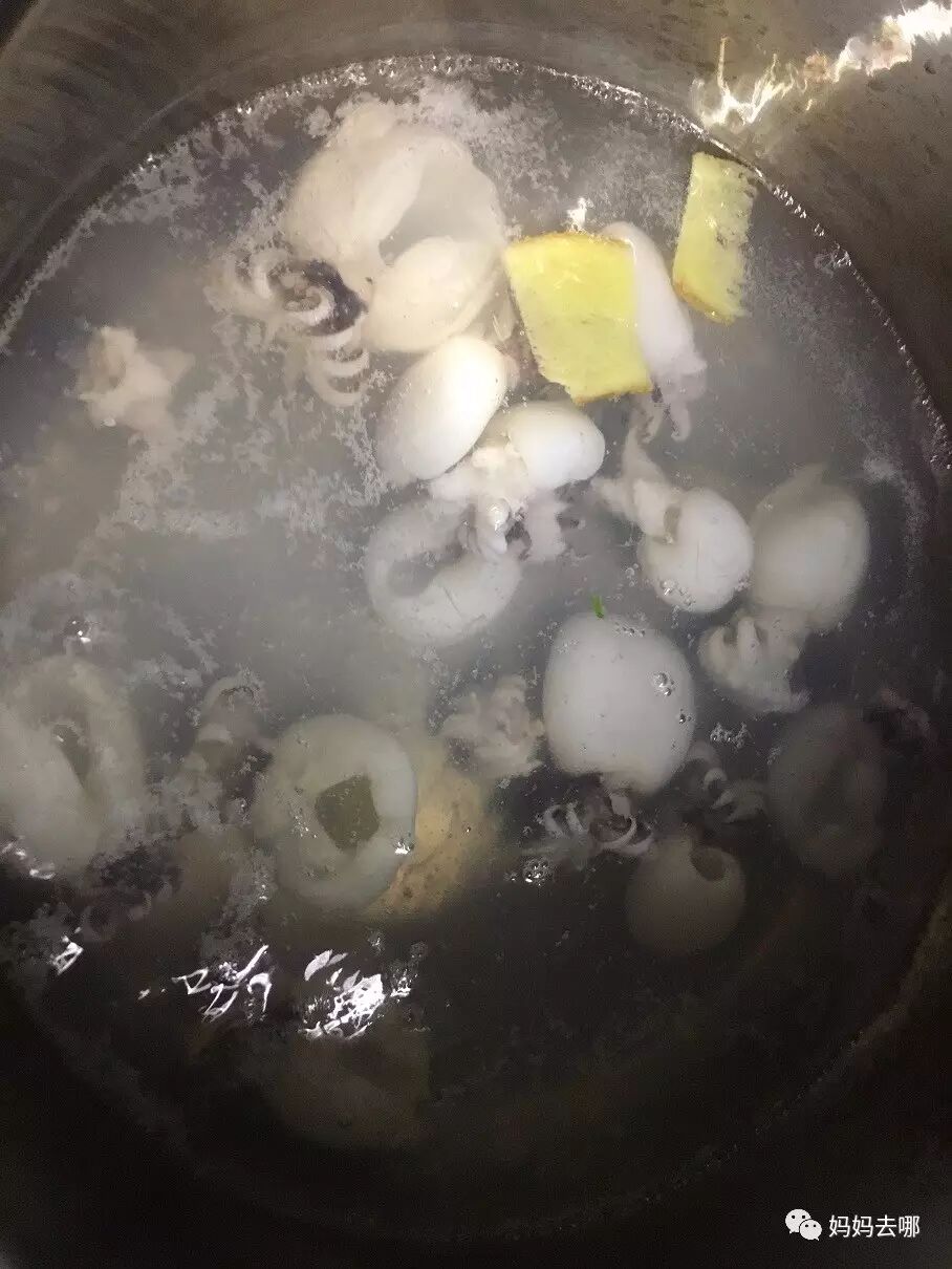 Tips:墨鱼仔焯水很必要,一个是祛除海鲜的腥味,一个是祛除海鲜过多的水份,口感更弹,有嚼劲。