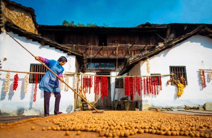 指南村有大片的银杏树高大挺立,每当秋天来临,红、黄、绿、蓝巧妙地搭配着,这里就变成了这个时节最美的江南村落。金色的辉煌在不远处上演,而村庄始终田园诗意。院前屋后铺满的金叶静静迎送每一个季节的来去,不卑不亢,自然安静。