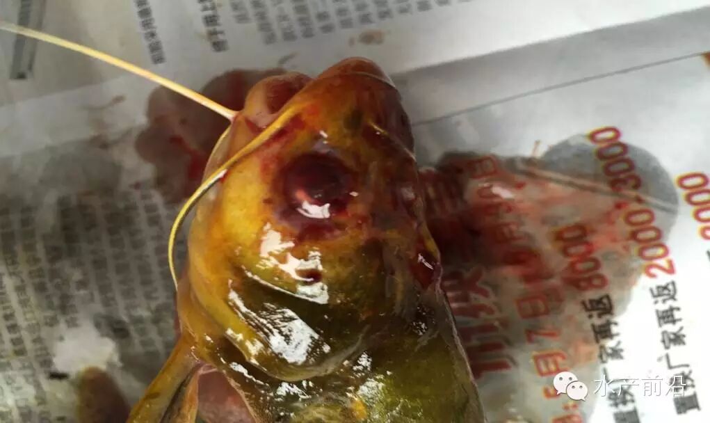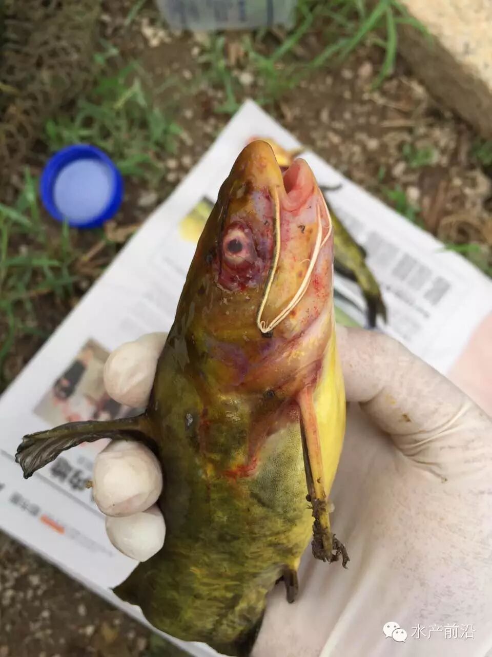 发病初期无明显临床表现,随着病情发展,鱼吃食减慢,严重时甚至不吃食。离群在池塘边游走或打转,有些悬垂于表层水体,只露出头(当地称“上吊病”),该病感染快,死亡率也很高。病鱼体表发黄,粘液增多,头部出血,眼球突出,胸鳍与腹鳍基部充血,下颚发红,部分鱼躯体有点状出血,如图1、图2。
