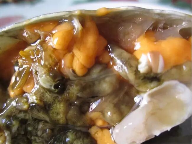 所有生食中唯这“江蟹生”的味道最令人叫绝。虽然其调料离不开酱醋酒以及味精类,但腌制出来的口感总是比其它生食类要略胜一筹。吃起来不粘壳不带腥,撅嘴轻轻一吸,蟹肉便脱离蟹壳滑入口中。