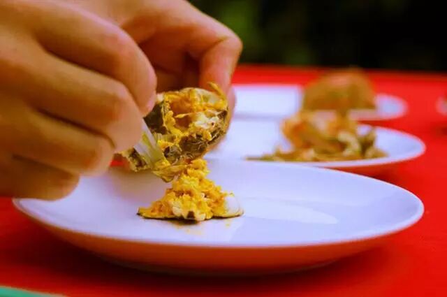 当你把它们都蒸熟之后,揭开那坚硬的外壳,便更能确定就是它了,它的肉很丰满,比一般人工养殖的都要多出很多肉来,蟹膏特别厚。吃一半蟹肉,再吃一半蟹膏,都记得蘸点专用的蟹醋,浙游君可以告诉你,不用浪费油钱跑去江苏吃了,就找个周末去余姚牟山湖吃就好了。