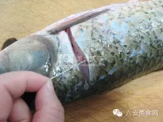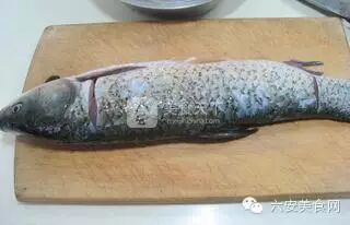 草鱼一条,去鳞去腥去腹内黑膜,在靠近头部一公分的位置,刀切开,靠近尾部的地方,切一刀