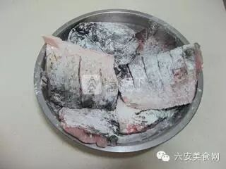将鱼身分成四块,入碗中,撒适量面粉,均匀地布在鱼身内外侧