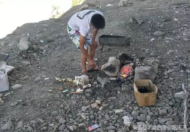 由表弟负责生火,靠近河边这样避免造成火灾。表弟在团场长大,生火技术一流,烤肉水平也很高。