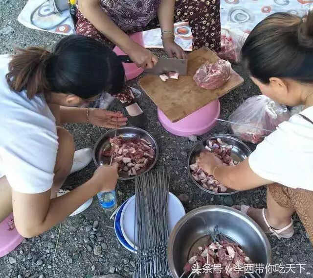 来的时候别人一家已经到了,桥底下的风水宝地没有人,被我们占领了。立马开始把羊肉切块,用烤肉签子开始串,要记着肥瘦相间,最好两肥三瘦才美味。羊肉是正宗的尉犁县罗布羊肉,要50元一斤呢。