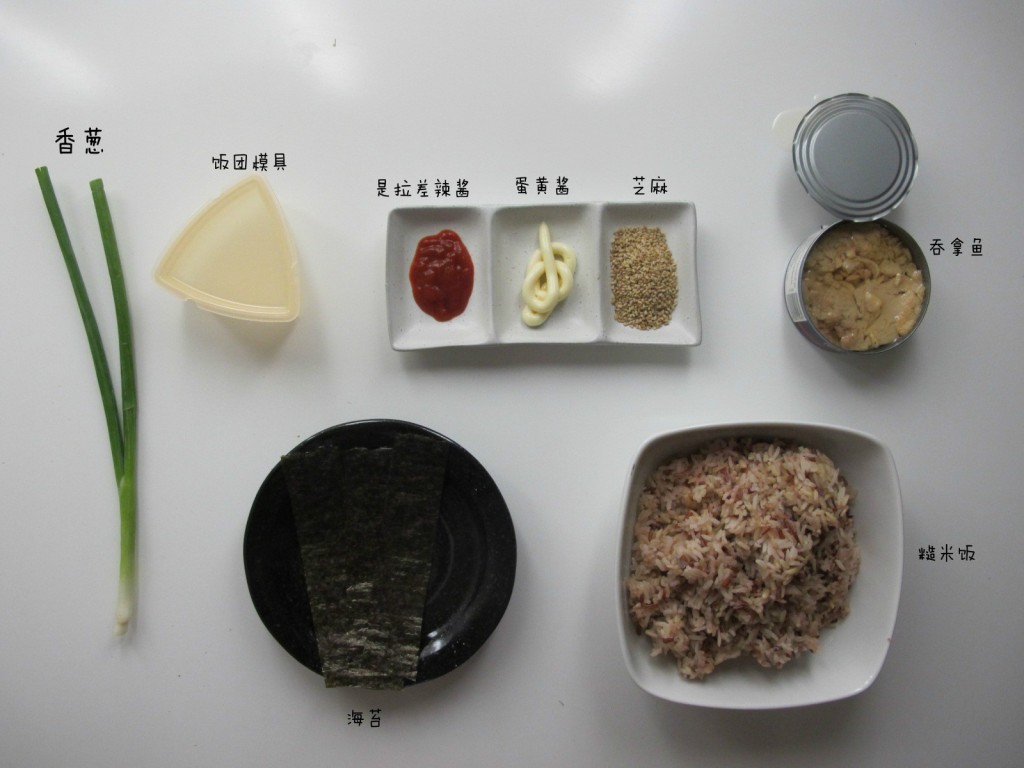 香葱1根,饭团模具1个,是拉差辣酱Sriracha Sauce 1茶匙,蛋黄酱1茶匙,芝麻2茶匙,海苔2-3片,糙米饭1碗,吞拿鱼罐头1个。