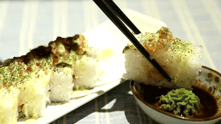 这寿司个头太实在,难以一口搞定,所以小编决定分层吃。顶料的木鱼丝和鱼籽酱混在一起入口,咬下去,鱼籽在木鱼丝柔的韧里爆开,有一种形容不出的绵密Q弹。略烧后的三文鱼别具风味,还有寿司卷里日本小町米的柔糯和卷心的清爽够味儿。