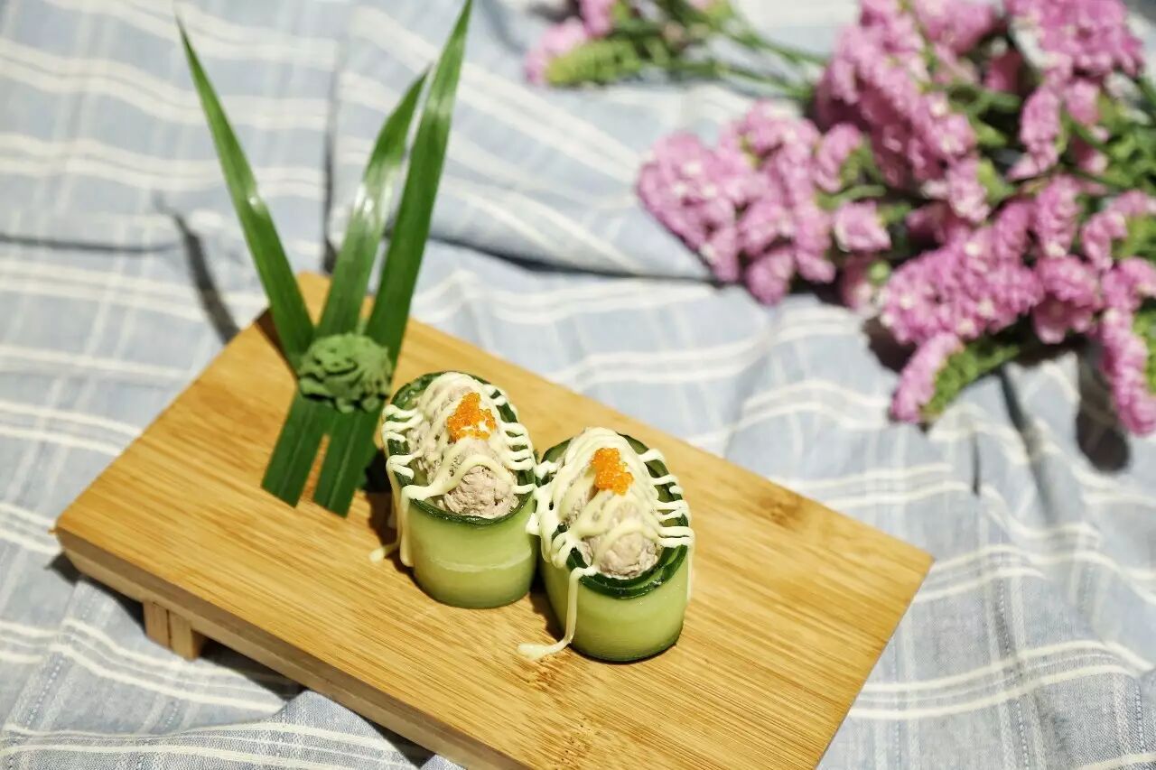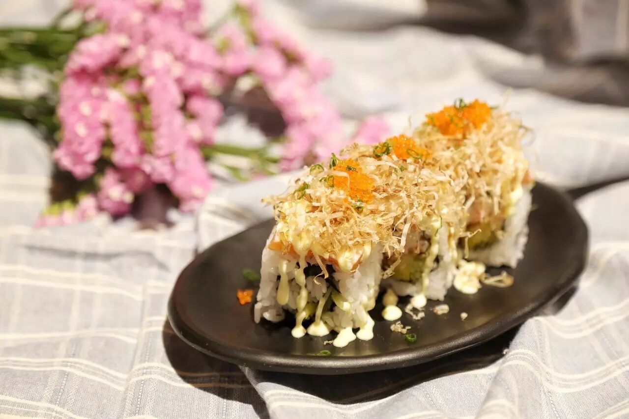 寿司卷、厚片儿三文鱼、木鱼丝、鱼籽酱