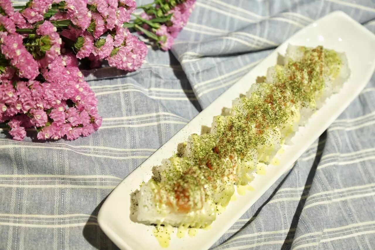 这款寿司,将三文鱼的鲜嫩和日本小町米的香糯可口体现得淋漓尽致,蘸一点儿蘸料,我才发现米饭也可以这么好吃。