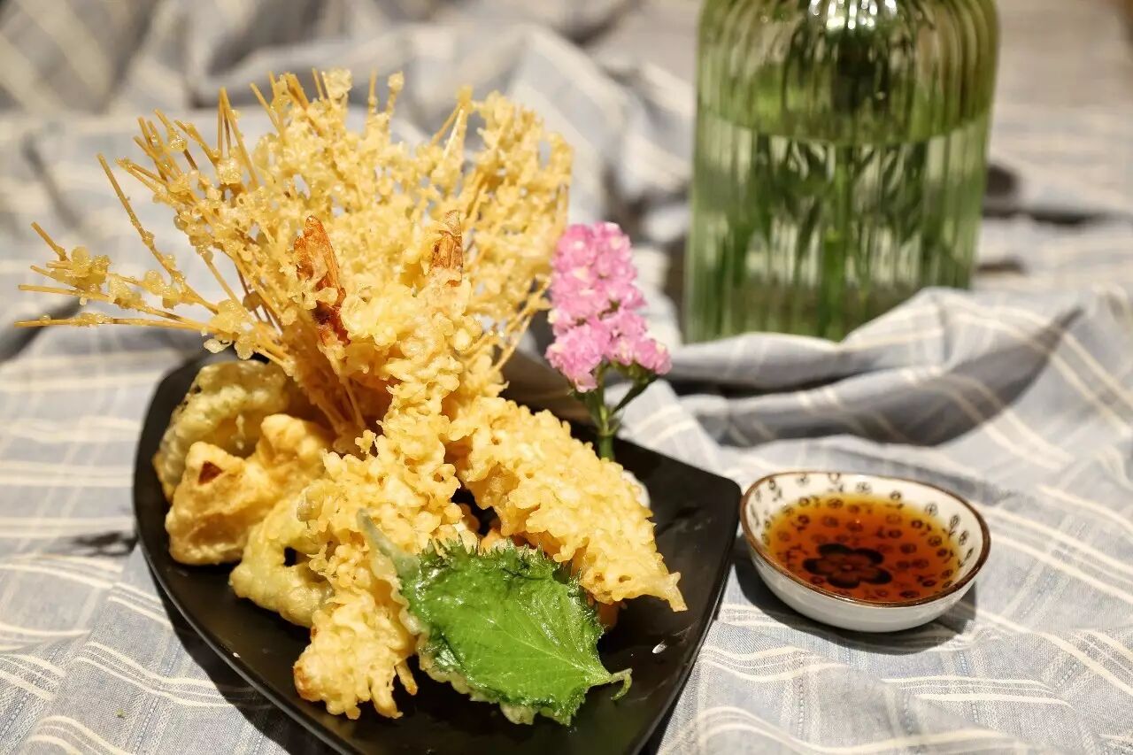 大明虾裹上面粉蛋汁,营养丰富,入口酥香还带点海虾特有的海洋味。下面配着着洋葱圈、青椒圈、紫薯块和南瓜块,紫薯和南瓜块微甜软绵,小编实在是爱不释口呐。