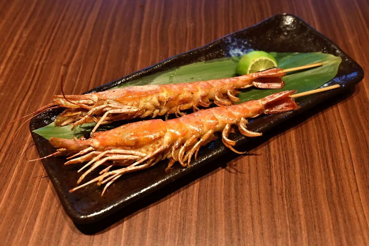 超大赤虾以盐烧的方法烹制,肉质结实、香口,撸个这么豪华的串儿,心满意足。