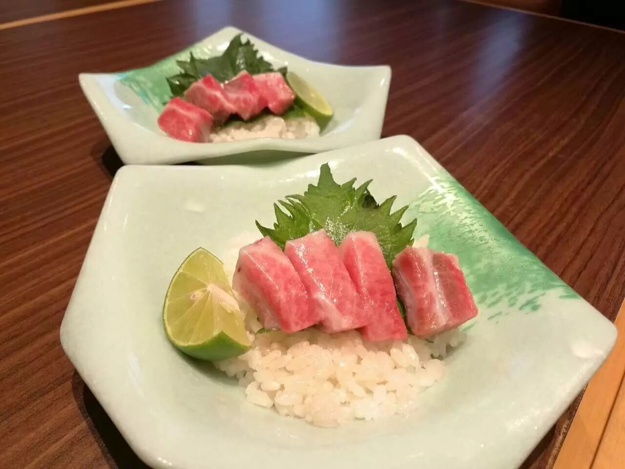 吞拿鱼有黄鳍、大目、蓝鳍等种类,其中蓝鳍吞拿鱼是最顶级的吞拿鱼,号称鱼中贵族,数量稀少,一斤售价高达千元。更何况,这碗饭里用的是吞拿鱼最贵最好的部位——拖罗(即鱼腩),可以品尝到的机会真是不多。