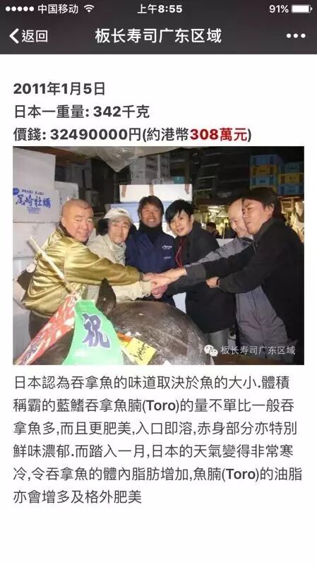 板长寿司曾在2011年拍下价值308万港币的日本一吞拿鱼▼