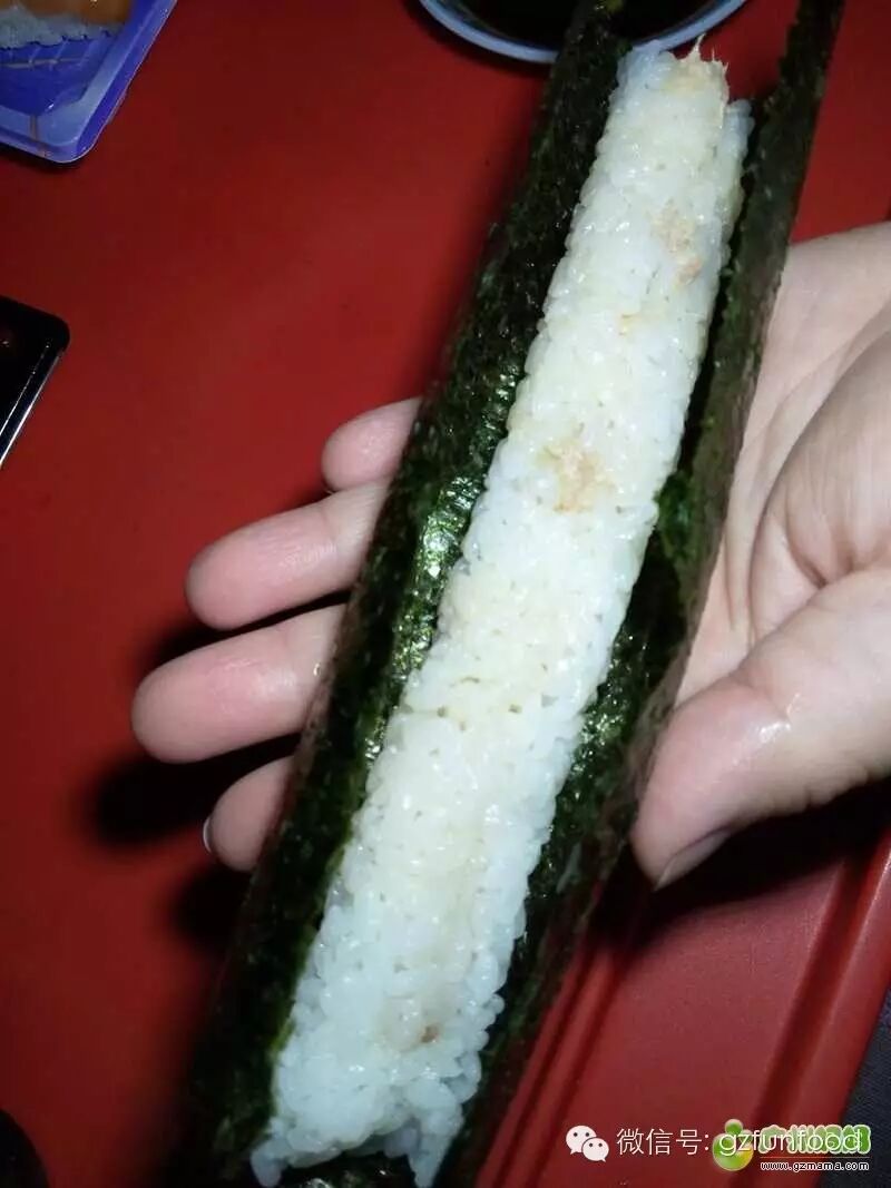 还有说好买满40就送的吞拿鱼脆卷,这个脆卷挺有心思的,紫菜用层胶纸独立包装了,再卷饭,于是紫菜和饭不相连,可以一直保持干爽的脆脆的,等吃的时候将胶纸撕去,继续包着饭团吃,脆脆的紫菜和湿湿的饭团,口感很好!