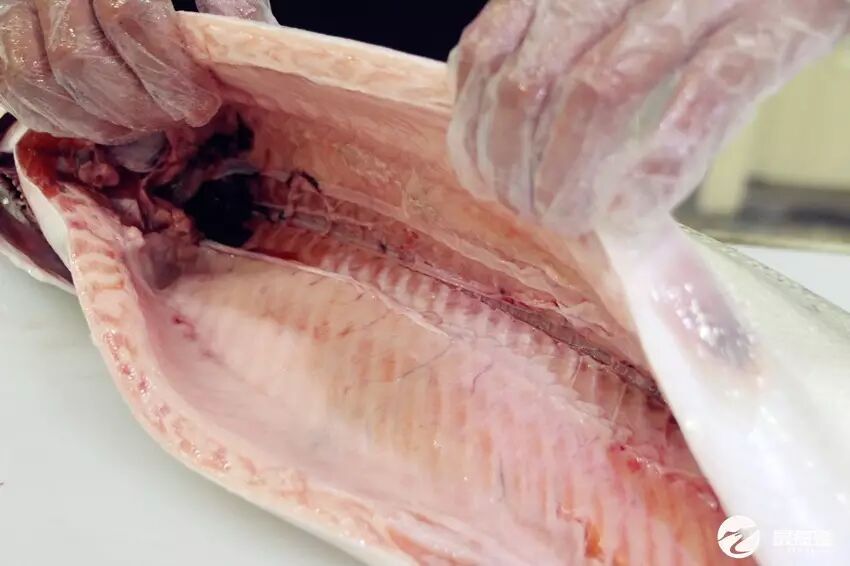 切成中块,把鱼皮和多余的粘膜、脂肪去除,干干净净的鱼肉只待切片。