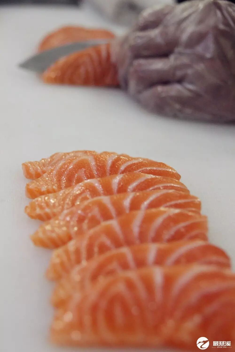 三文鱼是从挪威直运,当天到货,当天销售。三文鱼离水后一周内就到店里了,鱼眼透亮,鳞片都还闪着光。