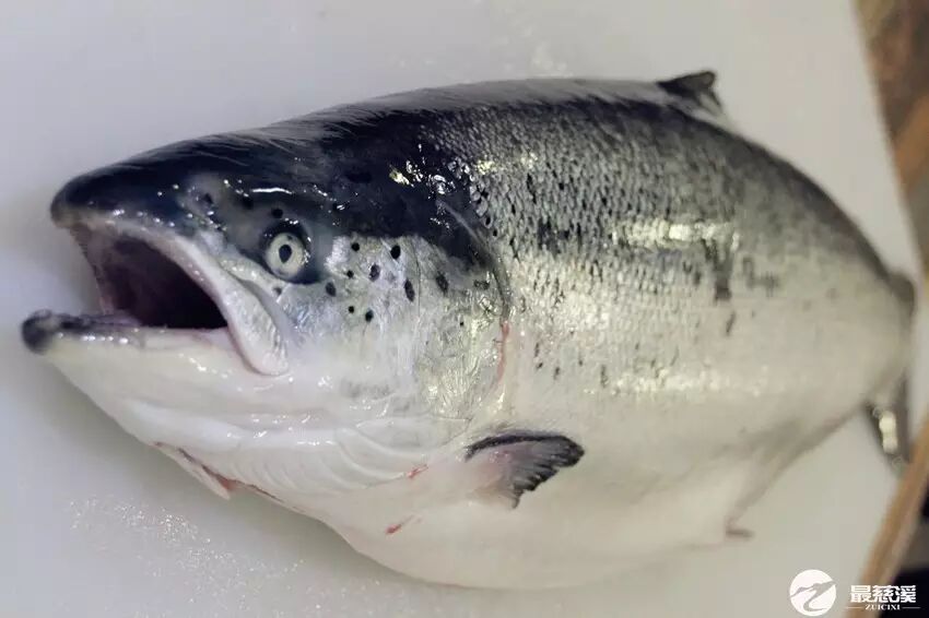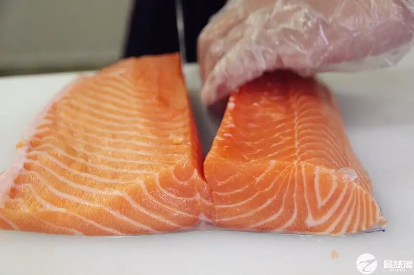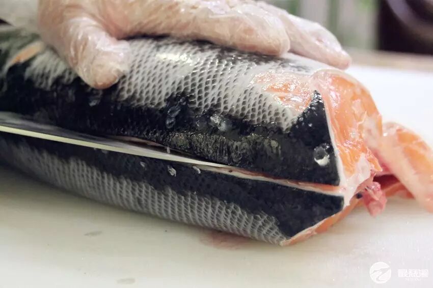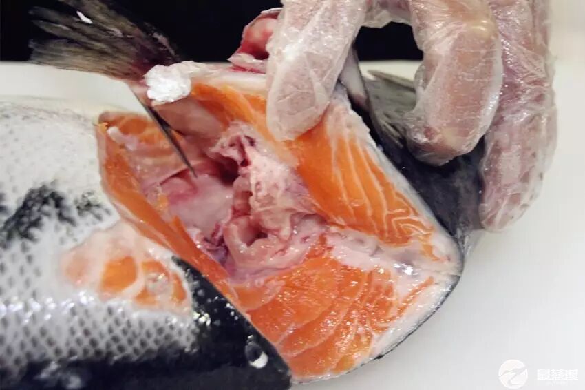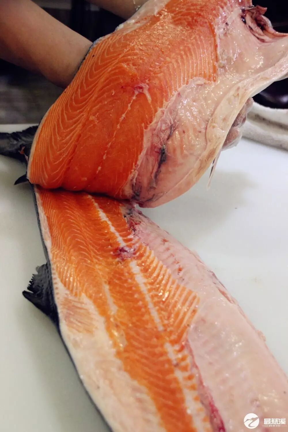 削掉鱼鳞,把鱼头切下来的瞬间,就可以看到最漂亮的橘红色的鱼肉。