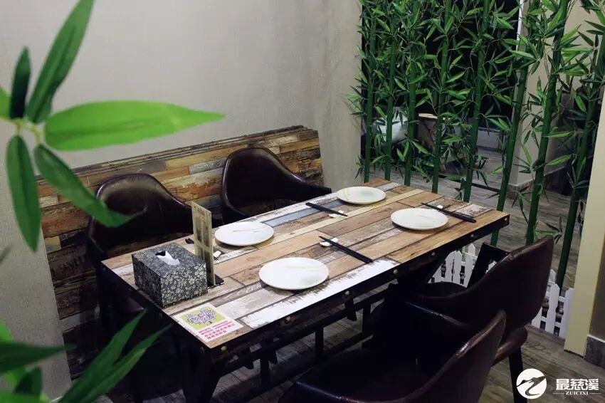 小包间用竹子隔开的创意非常不错,牙黄色墙面,翠绿色装饰,讨喜。