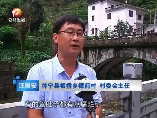 休宁县板桥乡樟前村村委会主任 汪国安:我们乡、村、派出所,以及有关部门,一起到那个双坑源那个河段,实地查看了一下,当时鱼死了很多。有的鱼都肚子都点腐烂了。当我们到那个地点的话,发现有一个袋子,有个休宁县农技推广站的药袋,是从那里发现是有人毒鱼的。