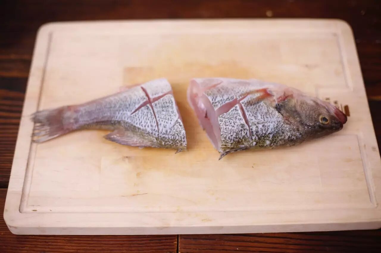 ②在鲈鱼表面打上刀花,根据锅的大小切段。