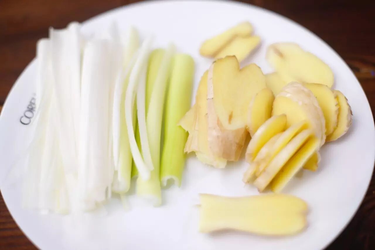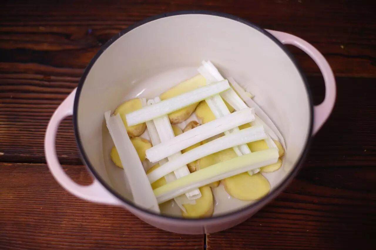 ③在Corningware康宁铸铁锅中加入少许油涂抹均匀,然后铺上葱姜。