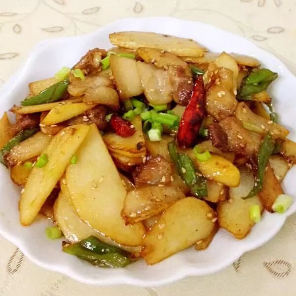 用料: 五花肉、土豆小两个、红尖椒、葱段、油、盐、生抽;