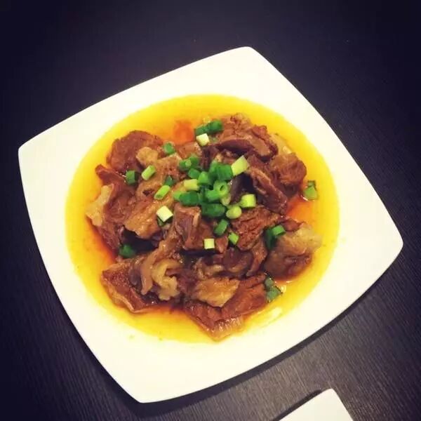 用料: 牛腩 800g、葱 1根、辣椒粉 1Tbsp、青蒜 1根、花椒粉 1 tsp、姜 1小块、白糖 1.5 Tbsp、大蒜 一整头、香油 1/2 Tbsp、花椒粒 1/2 Tbsp、大料 1个、酱油 10 Tbsp、高汤(清水) 2.5 cup、料酒 3 Tbsp、辣椒酱 2Tbsp、盐 1 tsp、香叶 2片;