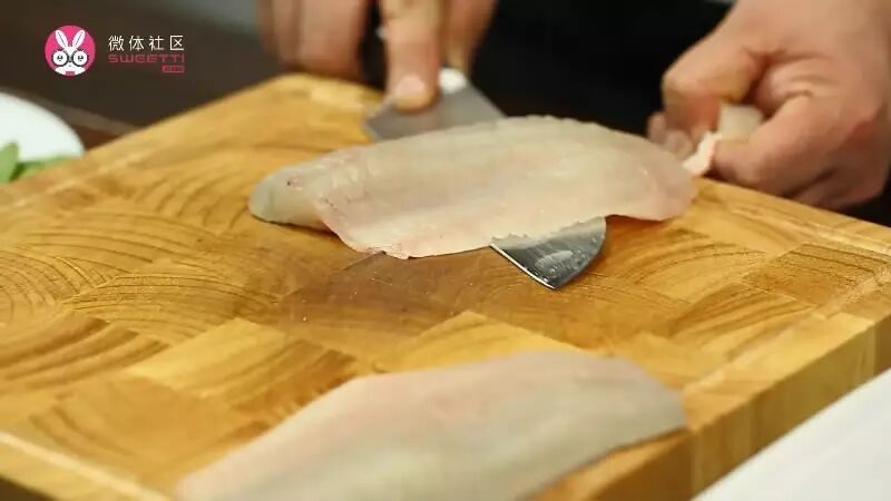 鲈鱼去头尾去骨,对半片成两片,去大刺再去皮。